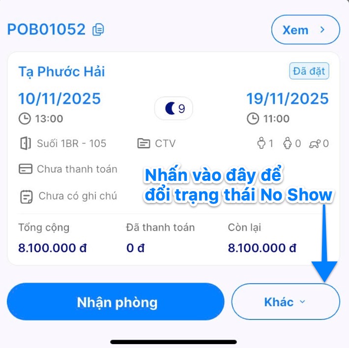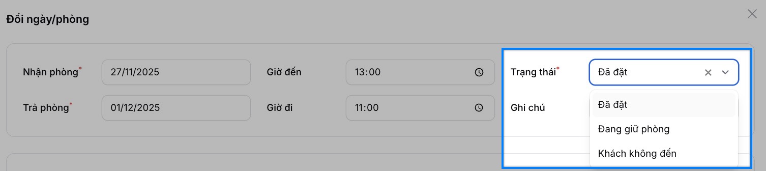 Trạng thái "Khách không đến" chỉ áp dụng khi khách chưa nhận phòng. Nếu muốn thay đổi trạng thái, bạn lại vào "Đổi ngày phòng" để cập nhật lại.