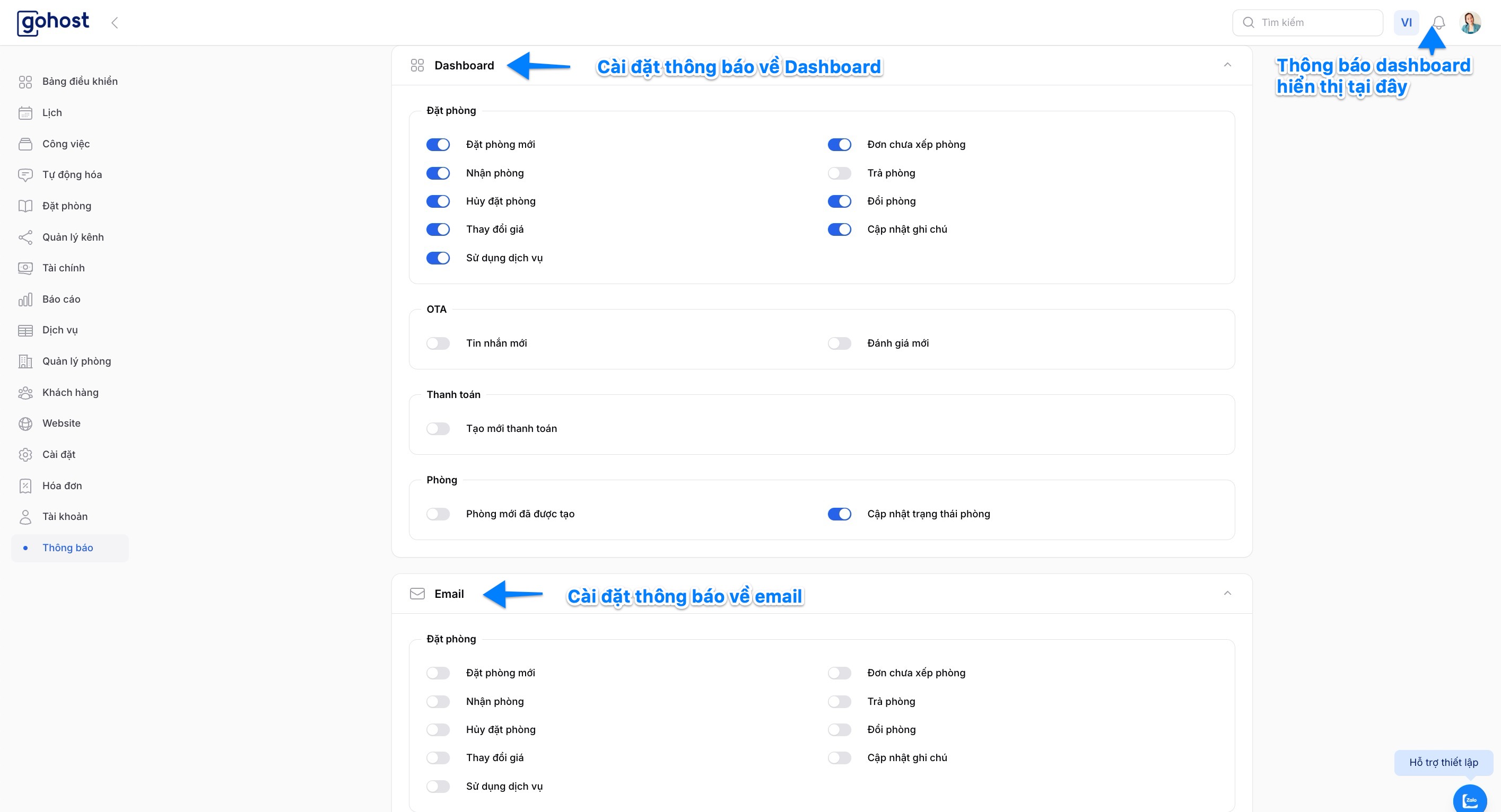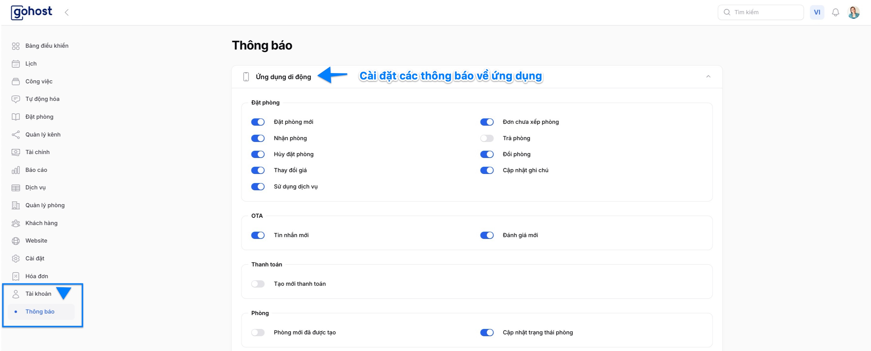GoHost cho phép bạn tuỳ chỉnh các thông báo liên quan đến đơn đặt phòng về 3 nền tảng: