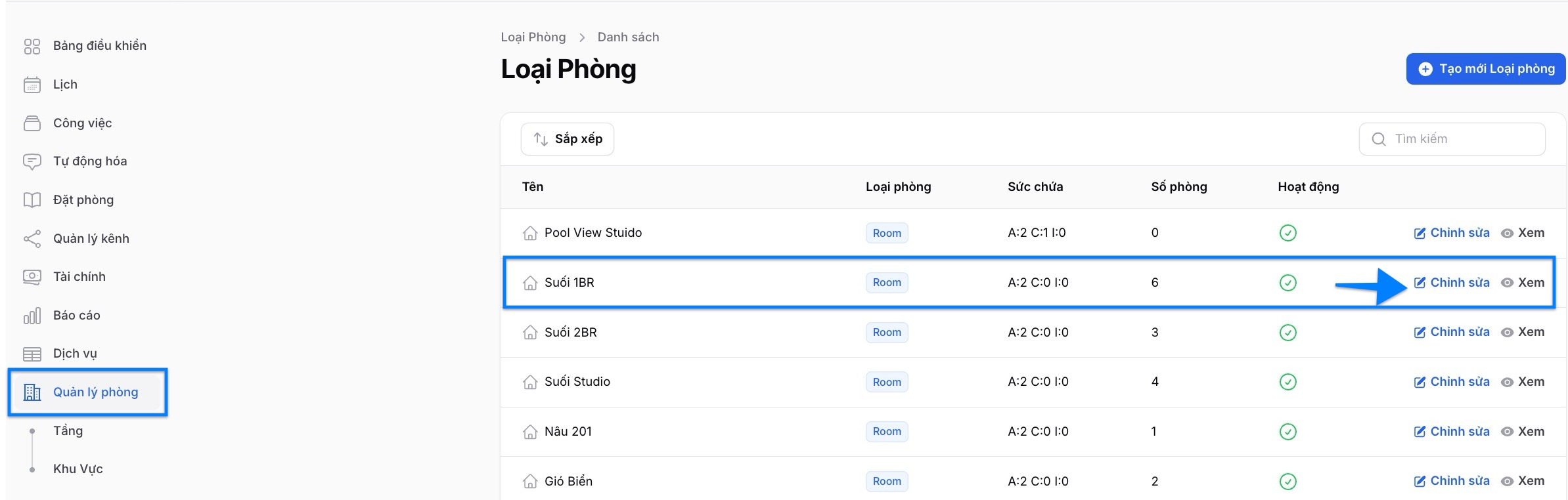 Bước 1: Truy cập Quản lý phòng -> Chọn loại phòng bạn muốn điều chỉnh -> Chọn "Chỉnh sửa"