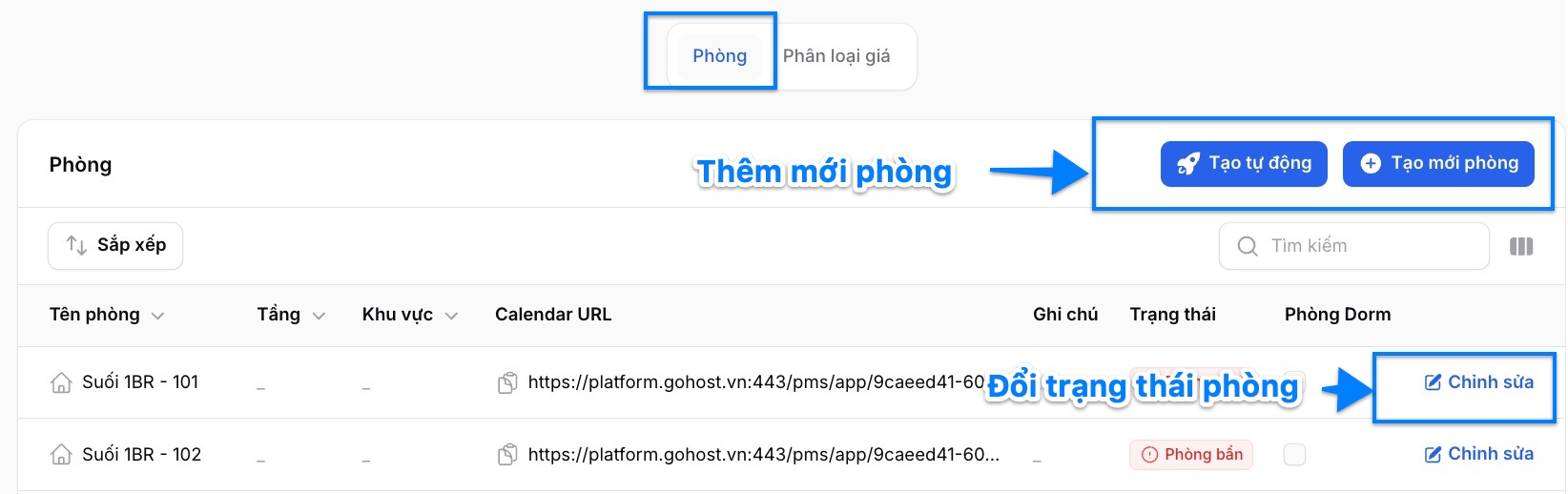 Bạn có thể chủ động thêm/thay đổi trạng thái phòng của các loại phòng đã có trên mục "Quản lý phòng". Hướng dẫn chi tiết như sau: