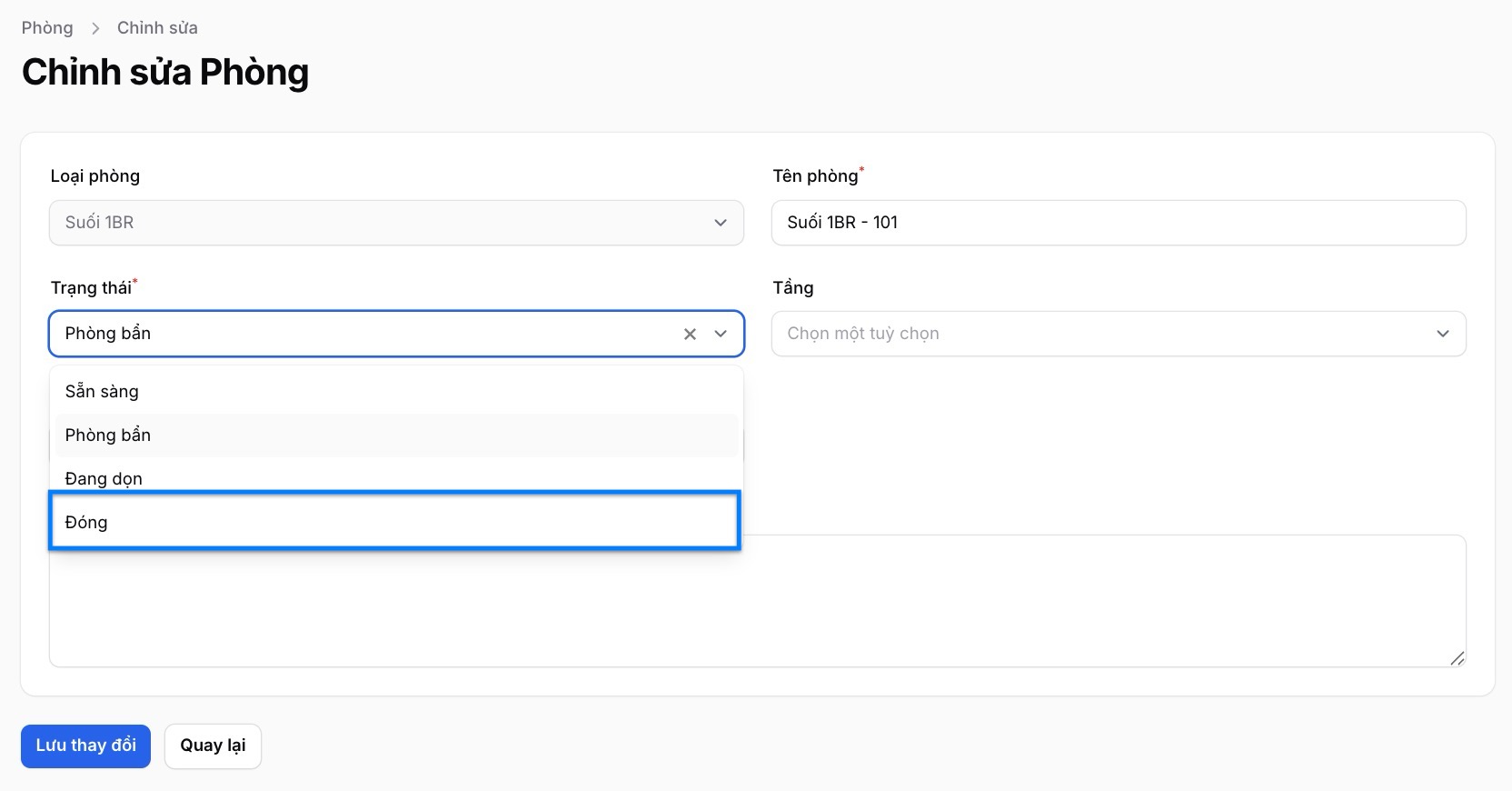 Để đổi trạng thái phòng: Chọn "Chỉnh sửa"