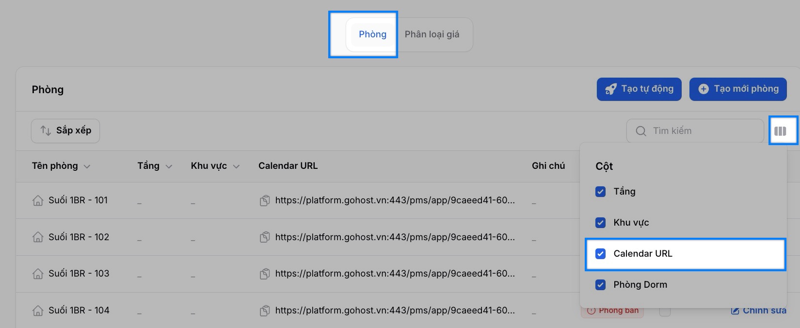 Bước 2: Tại tab Phòng => Bạn chọn biểu tượng column => Tick hiển thị ical