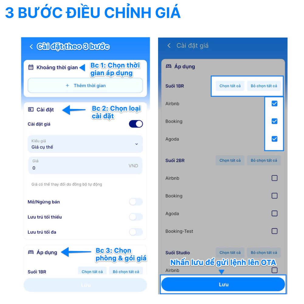 Cách 1: Tick chọn Ngày & Giá muốn điều chỉnh trên màn hình => Nhấn "Cài đặt gía"
