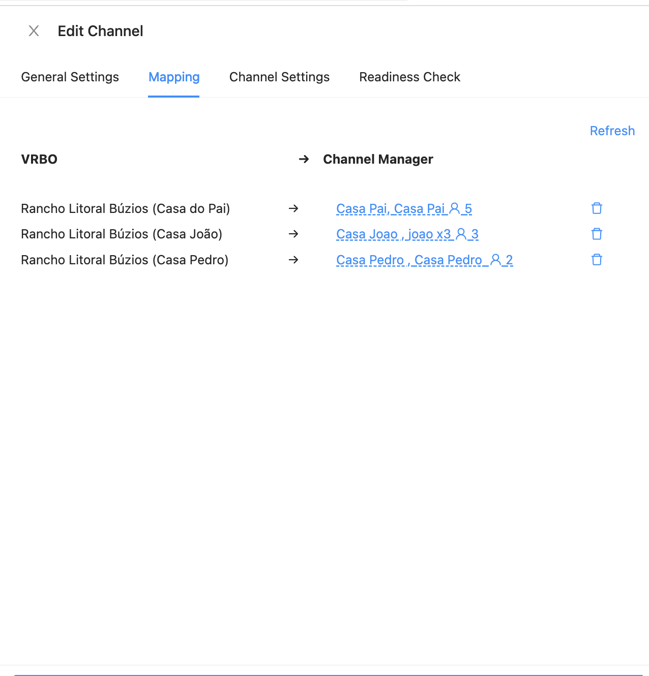 Trang mapping sẽ hiển thị toàn bộ listing từ VRBO. Bạn cần ghép (map) từng phòng và rate tương ứng với mỗi listing bạn muốn kết nối.