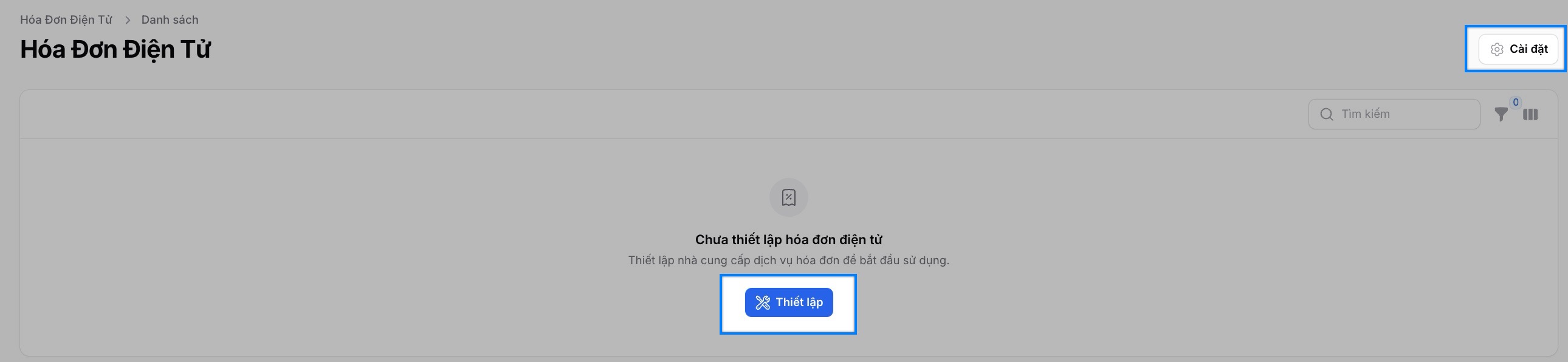 Hệ thống sẽ thông báo trạng thái "Chưa thiết lập hoá đơn điện tử". Bạn nhấn vào "Thiết lập" hoặc "Cài đặt" để truy cập phần thiết lập.