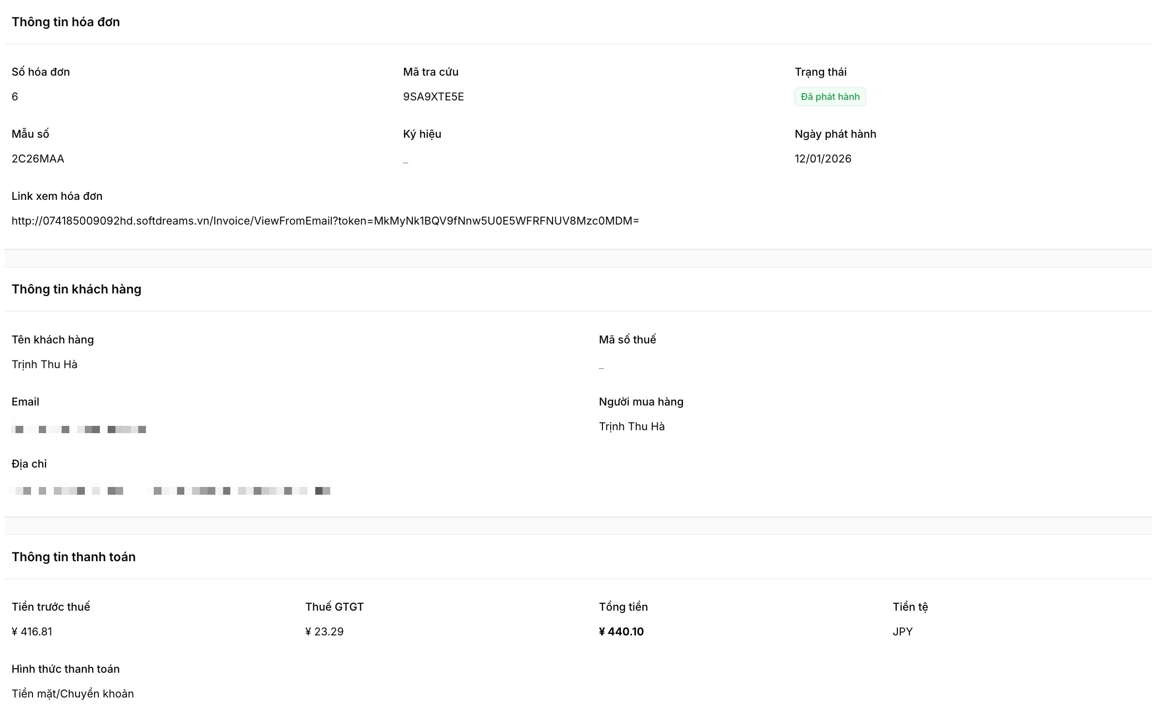 Trong chi tiết hoá đơn bạn sẽ lấy được link tra cứu hoá đơn, thông tin chi tiết về hoá đơn và thông tin khách hàng...