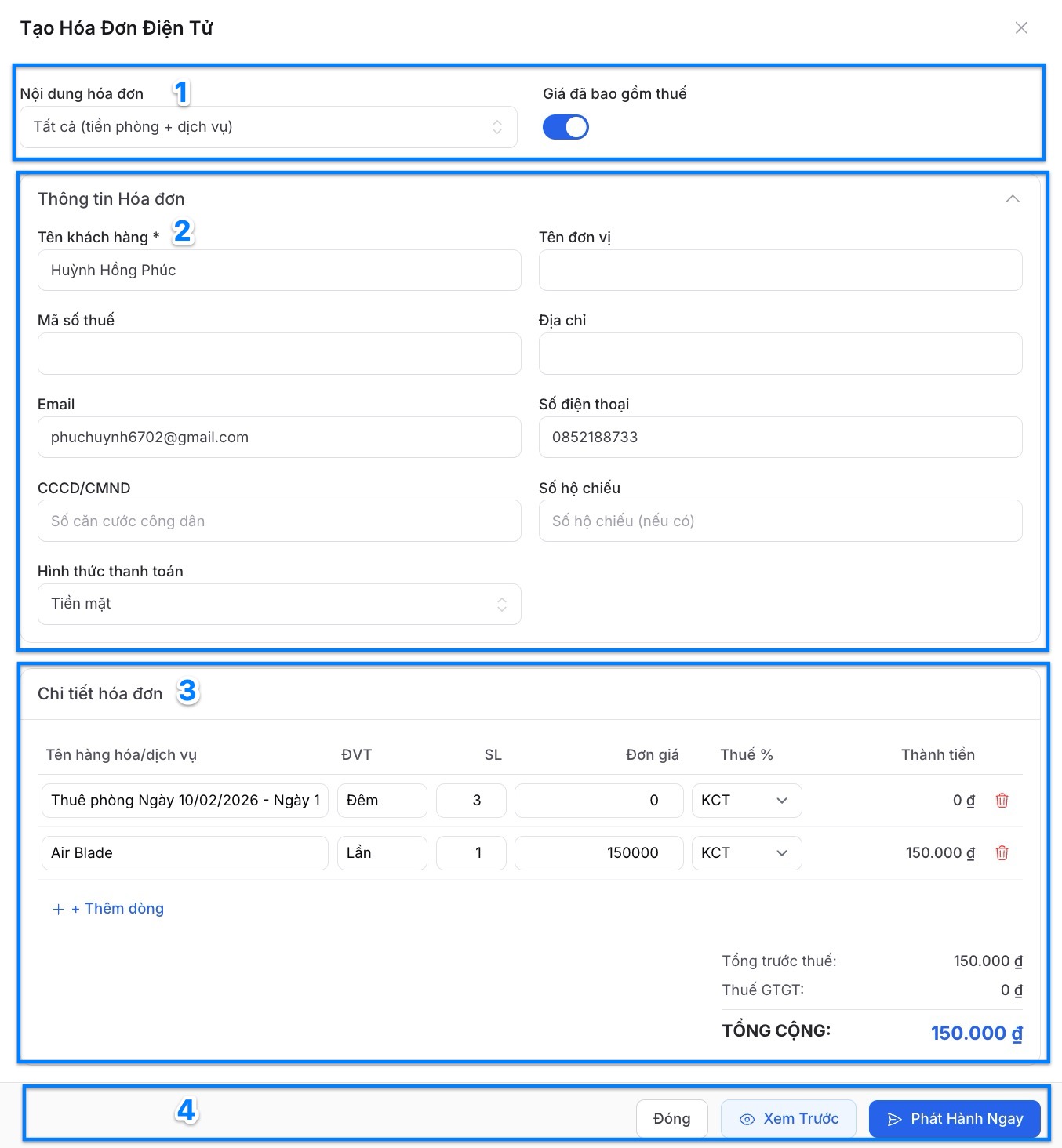 Thông tin khách hàng được lấy tự động từ mục "Khách" mà bạn cập nhật trong chi tiết đặt phòng. Nếu bạn cập nhật đầy đủ, các thông tin sẽ được điền sẵn tại mục này. Ngoài ra bạn cũng có thể tự nhập khi xuất hoá đơn. -
