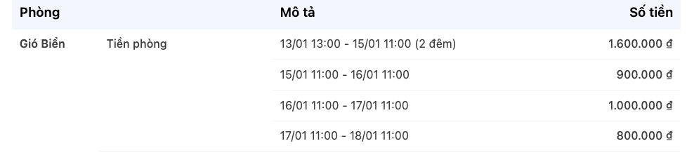 Ví dụ khách đặt đơn từ 13/1/2026 - 18/1/2026, trong đó chi tiết tiền phòng từng ngày như sau:-