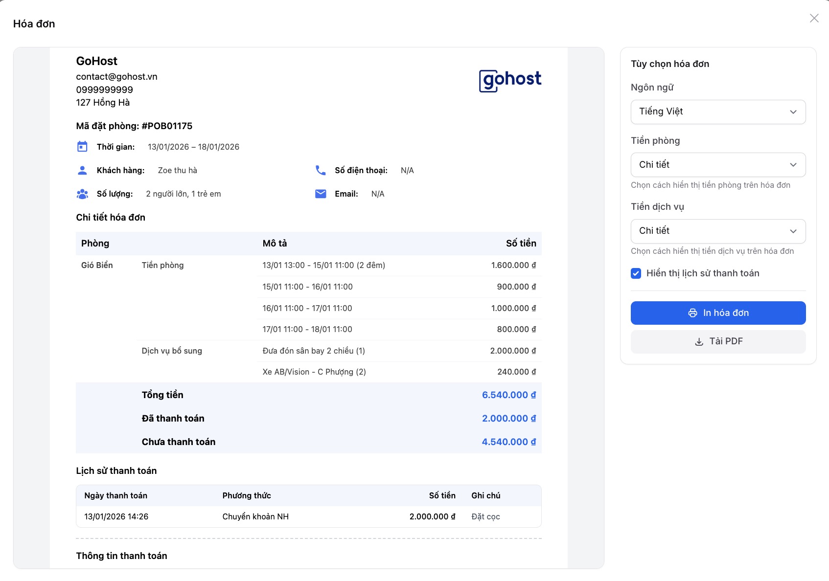 Dưới đây là hình ảnh của 1 hoá đơn được lựa chọn hiển thị chi tiết với tất cả thông tin tiền phòng, dịch vụ và lịch sử thanh toán.