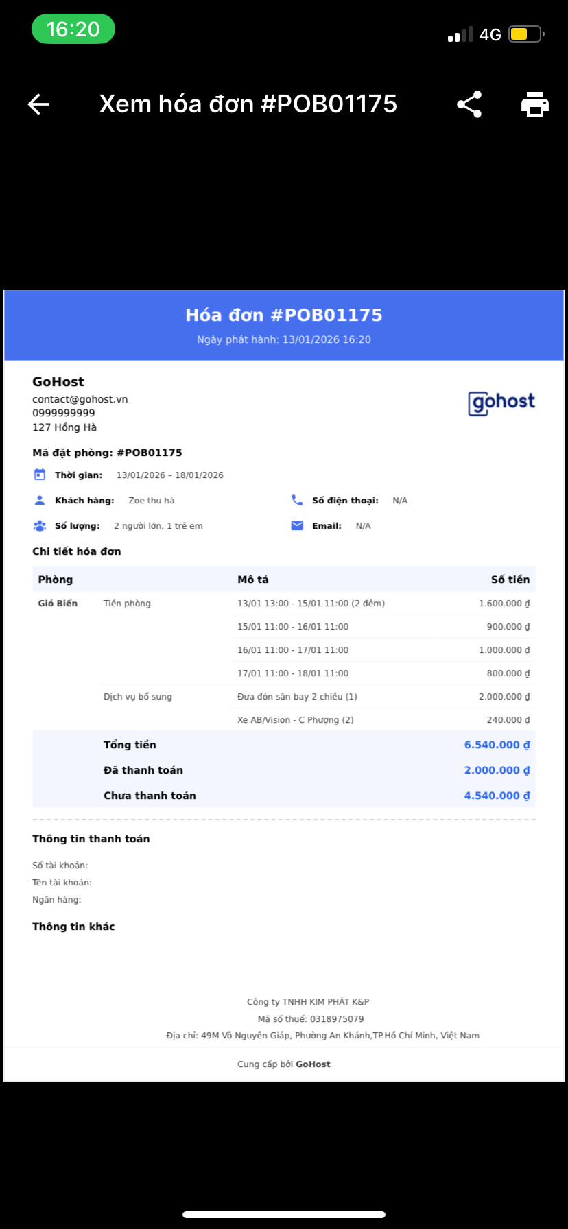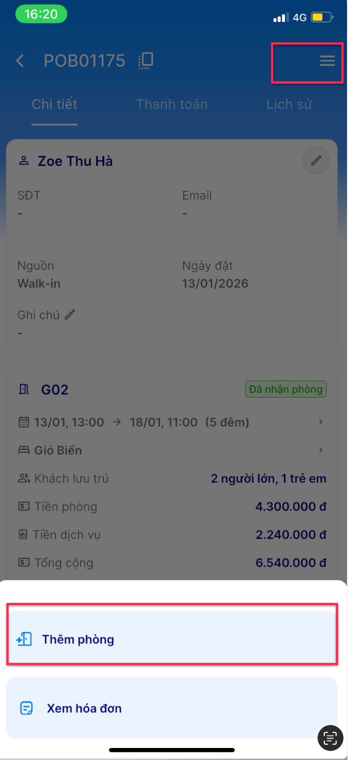 Tại chi tiết đặt phòng, bạn chọn nút "Hoá đơn" ở góc trên, bên phải màn hình: