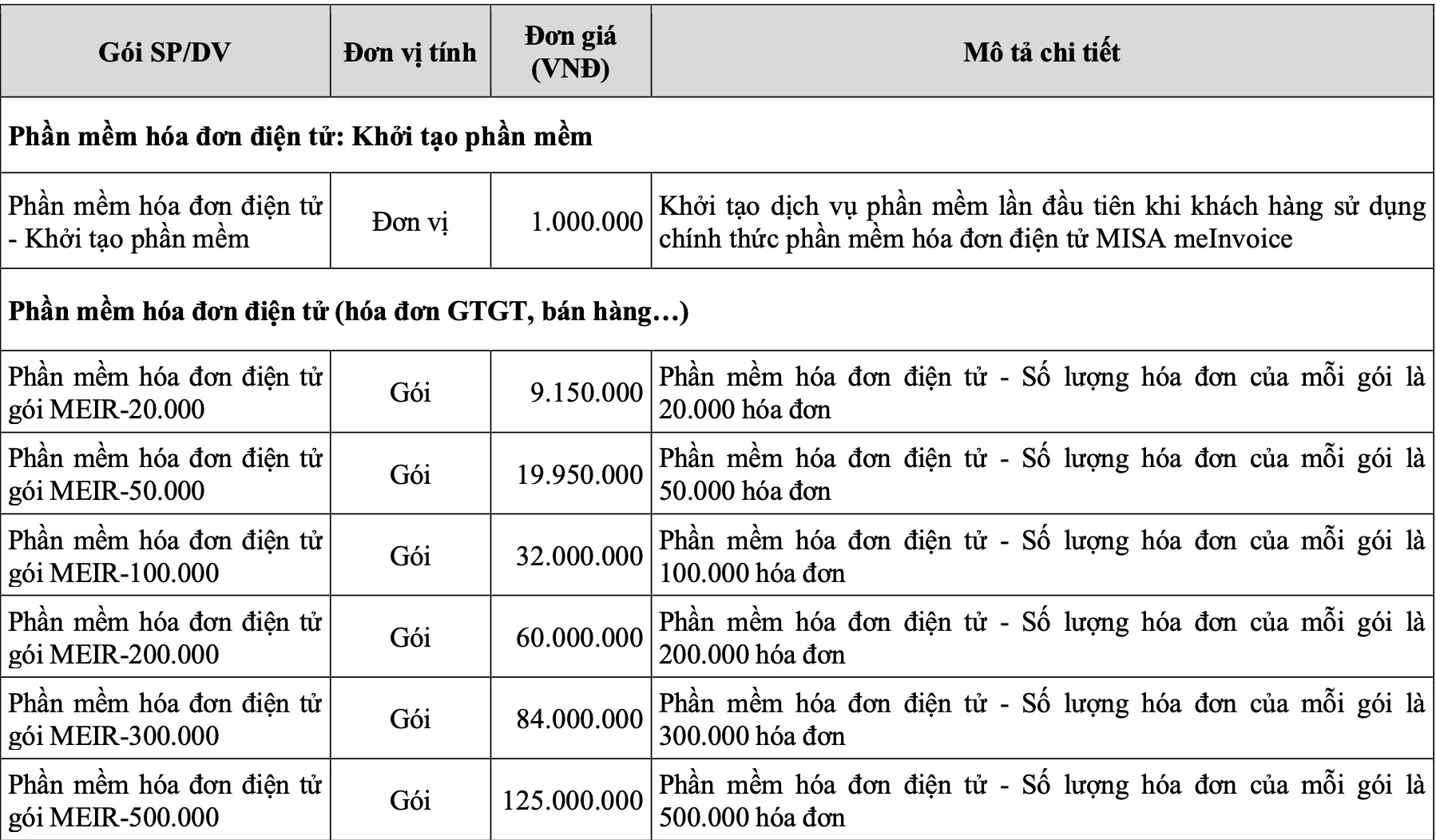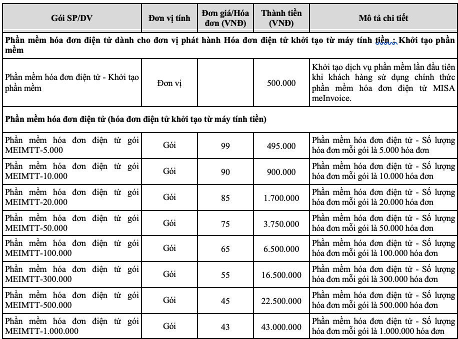 4. Cấu trúc chi phí dịch vụ Misa MeInvoice