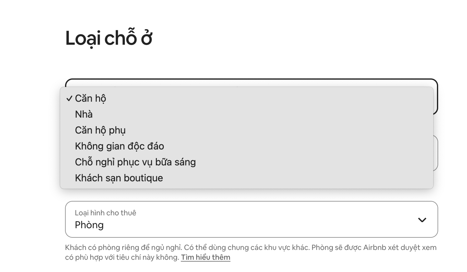 Thiết lập đúng loại tài sản trong mục Loại chỗ ở trên Airbnb.