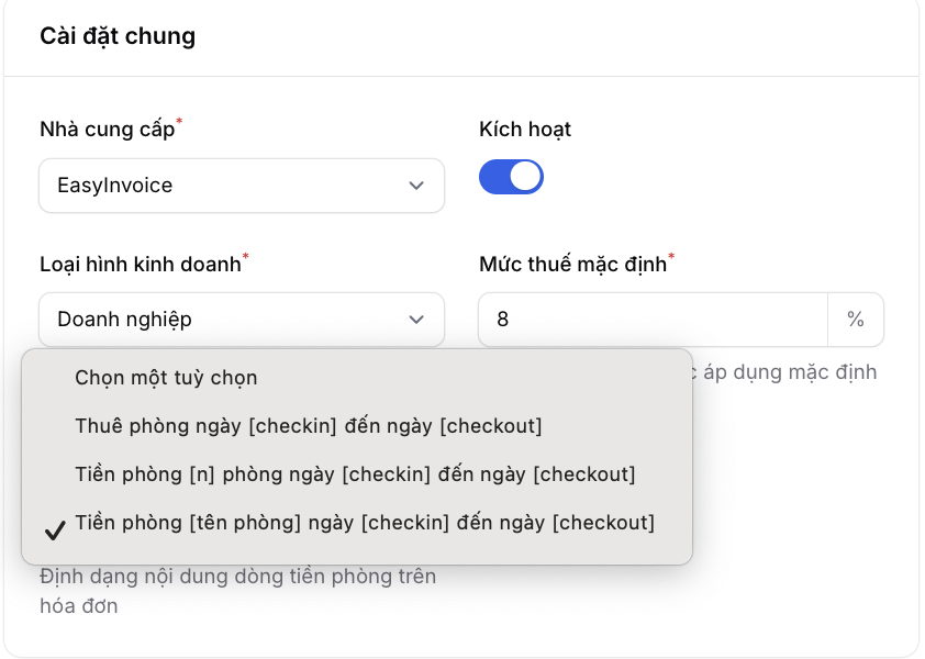 Tại mục Cài đặt của Hoá đơn điện tử, bạn chọn mục "Mô tả tiền phòng". Hiện tại GoHost hỗ trợ 3 mẫu tiền phòng như ảnh dưới. Bạn có thể tuỳ chọn để phù hợp với nhu cầu sử dụng.