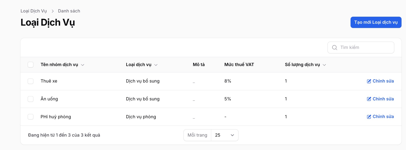 Cấu hình thuế cho dịch vụ được thiết lập ở mục "Loại dịch vụ". Bạn lựa chọn Chỉnh sửa -> Bật cấu hình thuế và cài đặt.