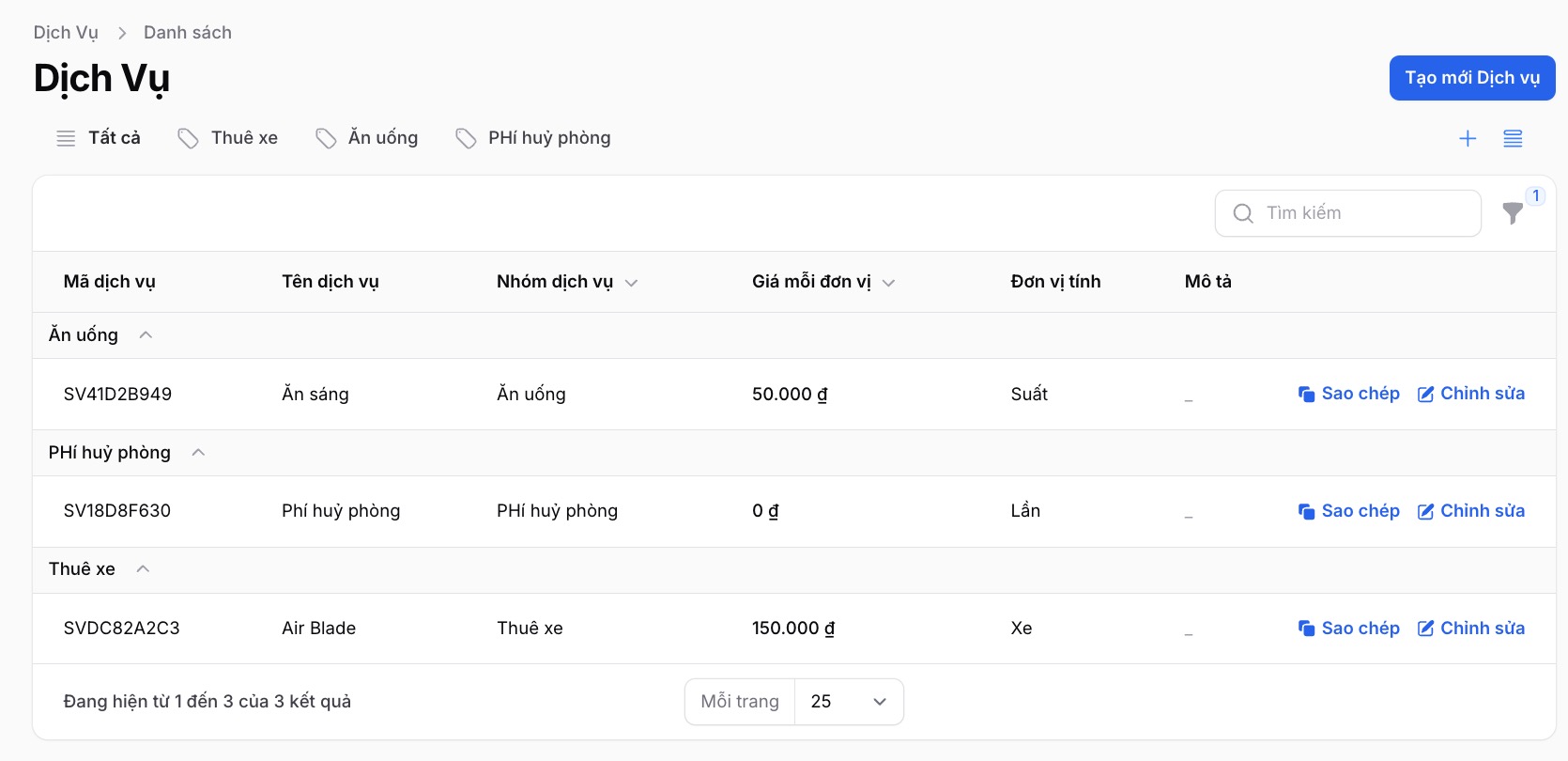 Bạn truy cập danh sách chi tiết dịch vụ và chọn chỉnh sửa để cài đặt đơn vị tính cho từng dịch vụ. Do tính năng này mới phát triển, nếu trước đó bạn chưa cài đặt hệ thống sẽ trả về là "-". Bạn hoàn toàn có thể tự điều chỉnh trong chi tiết hoá dơn