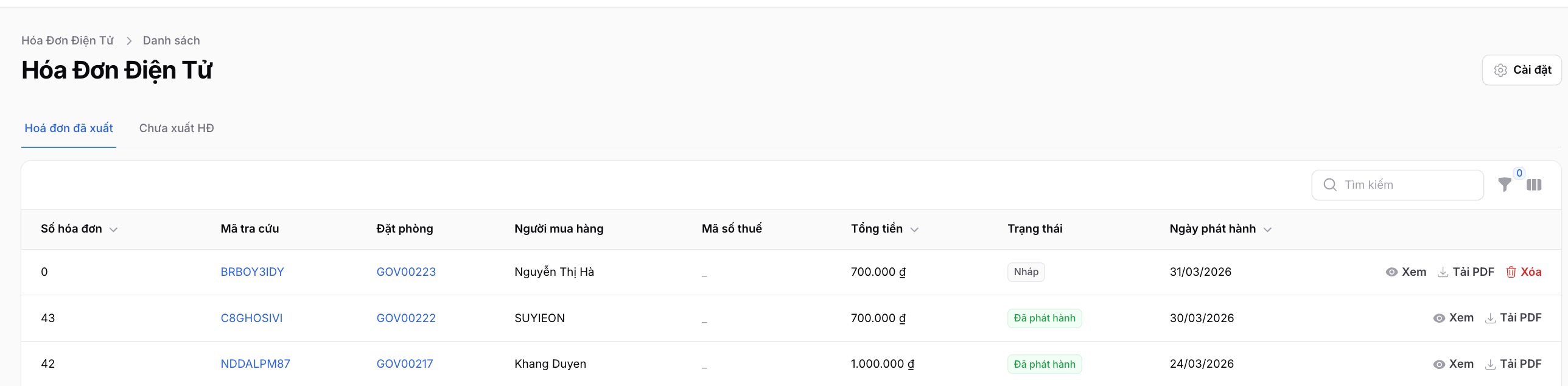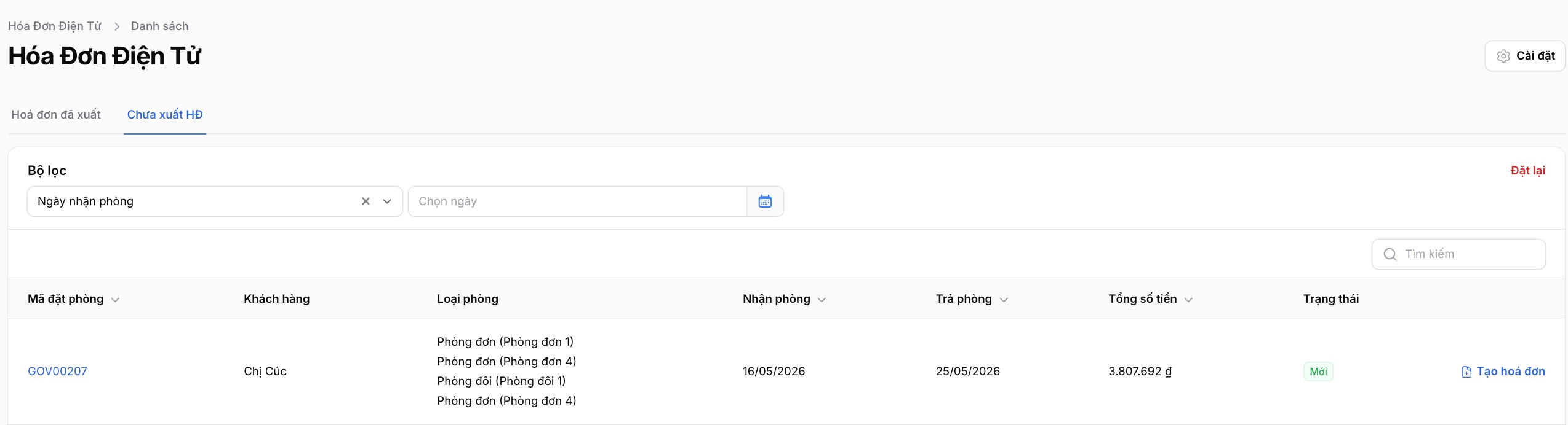 GoHost hỗ trợ bạn lọc ra danh sách các đơn đặt phòng chưa xuất hoá đơn để thực hiện xuất bù. Việc này giúp bạn có thể tránh việc xuất sót hoá đơn. Để sử dụng chức năng bạn truy cập: Hoá đơn điện tử -> Mục Chưa xuất hoá đơn.