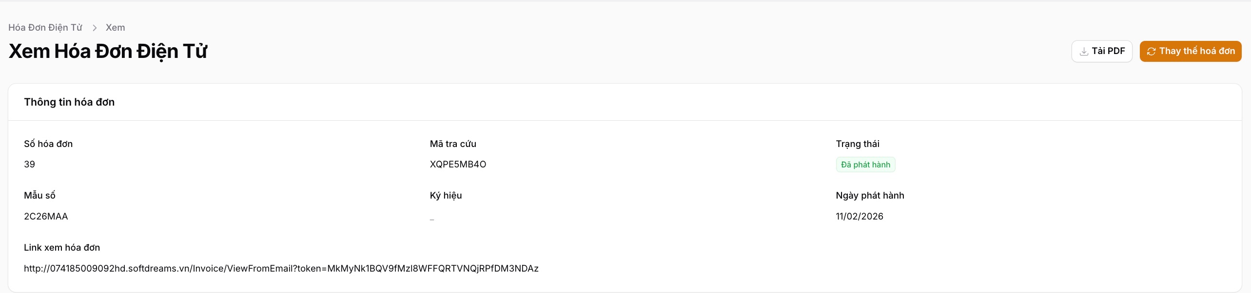 Sau khi thực hiện xuất hoá đơn (Nháp hoặc đã phát hành), bạn có thể lấy file PDF hoặc link bằng 1 trong 2 cách: